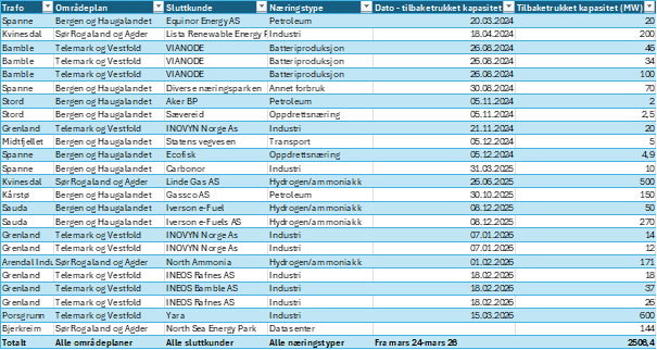 - Morrow Batteries (88 MW) i Arendal er det største industriprosjektet med fortsatt reservasjon, før Nordic Electrofuel AS (36 MW over to prosjekter) i Porsgrunn og Norsk Hydrogen AS (35 MW) på Rjukan
