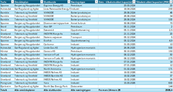 | Trafo | Områdeplan | Sluttkunde | Næringstype | Dato – trukket kapasitet | Trukket kapasitet (MW) |