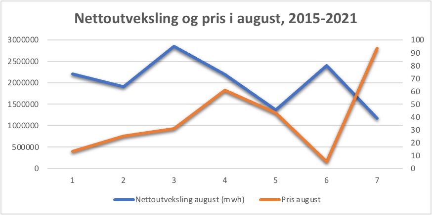 Om de høye prisene i Norge skyldtes at vi eksporterer for mye kraft, så skulle kraftutvekslingen vært høy når prisene er høye, eller like før prisene blir høye om eksporten forårsaker ressursknapphet i det hjemlige markedet. Dette synes ikke å være tilfellet i dag. Nettoutveksling er lav i både august og september, samtidig som prisene er høye.