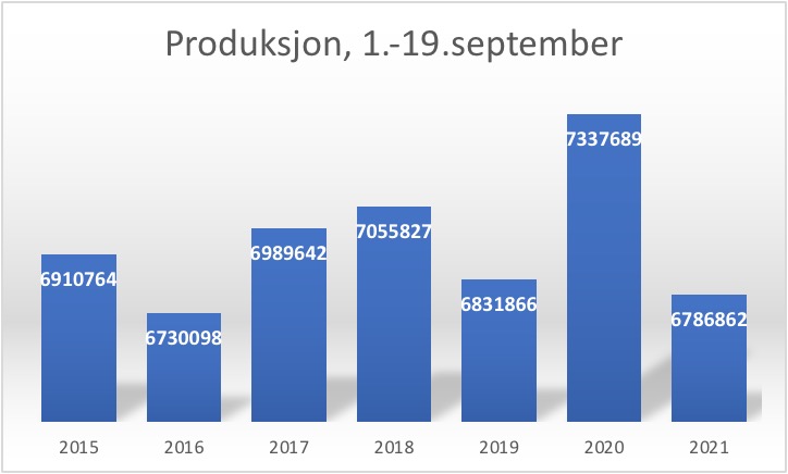 Vi produserer lite vannkraft. Produksjon i perioden 1.9-19.9, er den laveste i 2021 siden 2016.