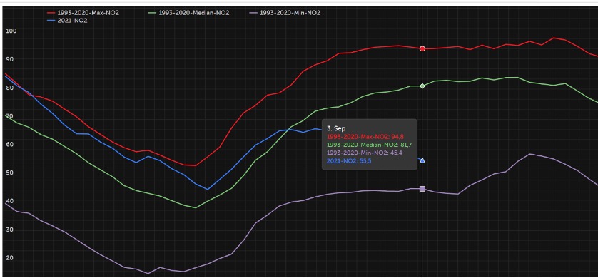Den 3.september 2021 var fyllingsgraden i prisregionen for Sør-Norge u/Oslo på 55,5%. Dette er nærmere minimumsnivået på 45,4% på samme tidspunkt for hele perioden 1993-2020, enn middelnivået for samme tidspunkt i perioden 1993-2020 på 81,7%.
