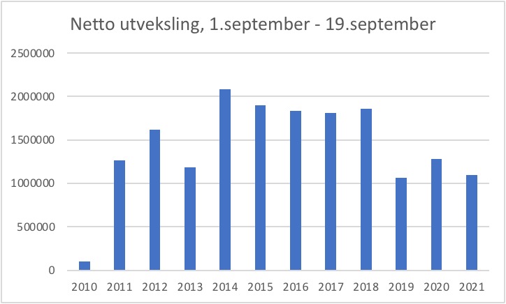 1. Nei, det er ikke feil. Jeg snakker her om nettoutveksling i perioden 1.9-19.9, og i denne perioden er nettoutveksling i 2021 den laveste siden 2010, med unntak av 2019. Nettoutveksling i august likeså – men også lavere enn i 2019. Da sammenligner vi den samme måneden i hvert år. Det gir ikke stor mening å sammenligne august/september med februar, fordi det er ulike værtyper som preger vinter og sommer, og disse gir selvfølgelig store svingninger i produksjon og eksport. Selvsagt eksporterer vi mindre kraft i februar når det er kaldt i Norge og det er store behov for oppvarming, enn på sommeren når det er smelteis i elvene, mer vått vær – og varmere i været med mindre behov for energi til oppvarming.