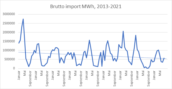 Brutto import: Importen har blitt mindre siden januar 2013, men gjorde tydelige hopp i tørr-årene 2018 og 2019. Vår/sommer 2020 var importnivået rekordlavt på grunn av flom og store mengder vann.