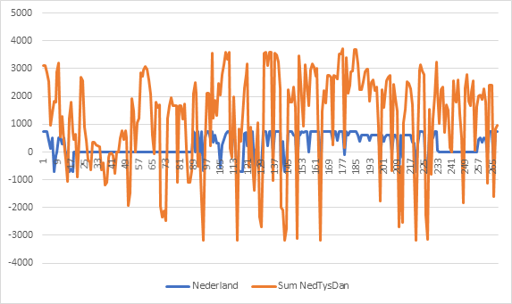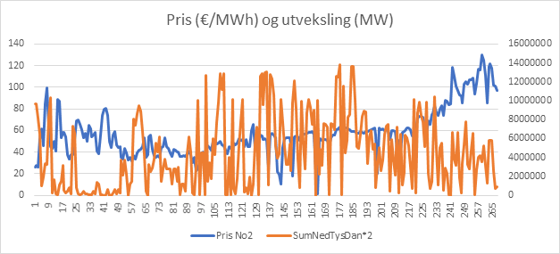 I tillegg har jeg samlet data for effekt i forbindelsene med Nederland, Tyskland og Danmark i 2021. Prisene i kraftmarkedet blir til «i øyeblikket». Derfor har jeg fanget flere øyeblikk, og registrert flyten i forbindelsene med Nederland, Tyskland og Danmark kl 12.00 hver dag i 2021, fra 1.januar til 25.september, og registrert prisen i prisområde NO2 på samme tidspunkt. Dette gir en tidsserie med 269 observasjoner som kan antyde eventuelle sammenhenger mellom endring i flyt og endring i pris.