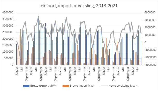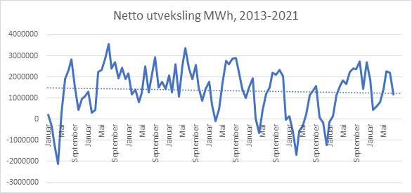 Netto utveksling: Netto utveksling er eksport-import, måned for måned. Denne balansen var negativ i begynnelsen av 2013. Dette gjentar seg i januar 2017, og i vintrene 2018 og 2019 er balansen også negativ. Det betyr at vi i disse periodene er avhengig av å importere strøm fra utlandet. Hadde vi ikke hatt kabler til å eksportere overskuddsstrøm under flom-året i 2020 og de fuktige somrene, hadde vi heller ikke hatt kabler til å importere strøm når vi er i underskudd.