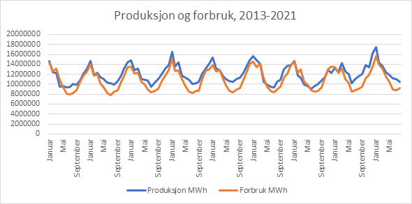 Produksjon og forbruk: Hverken produksjon eller forbruk er på et ekstraordinært nivå i 2021. Riktignok ble det produsert merkbart mer kraft i 2020 enn i foregående år, og forbruket vokste til en viss grad etter. Men produksjon og forbruk skjer i jevne sykluser, der vi lagrer vann fra mai til september, og produserer og forbruker mer når det er høst og vinter. Dette viser også at vi ikke har overprodusert i vår eller tømt lagrene uforholdsmessig i forkant av prisveksten.