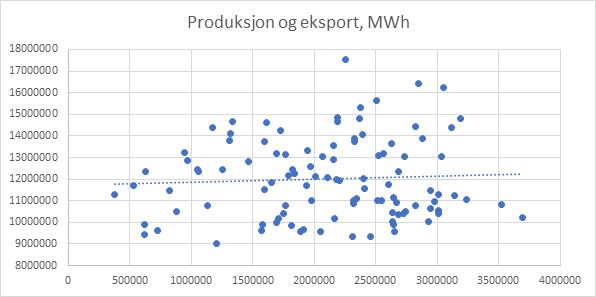 Produksjon og eksport: Det er med andre ord ingen åpenbar sammenheng mellom mengde eksport og høye priser. Det ser i større grad ut til å være en positiv sammenheng mellom høy produksjon og høy eksport.