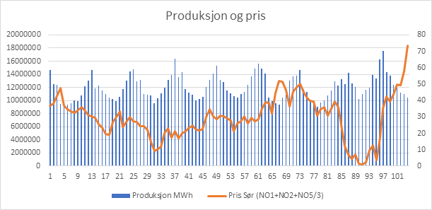 Produksjon og pris: Pris for sør-Norge (høyre akse) lever tilsynelatende et liv uavhengig av produksjonsmengde innenlands. Dette er gitt at det opprettholdes en produksjon som står i stil til forventet forbruk og reelt behov. Skal høye priser derimot dempes ved hjelp av overproduksjon, så må lagrene tømmes ganske gjennomgående for å gi en rask og omfattende priseffekt. Men da vil det være mindre vann igjen å produsere kraft ut av når vinteren kommer. Og det er på vintrene vi er avhengig av å produsere mest kraft.