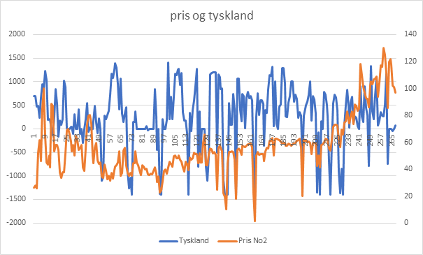 Aktiviteten i tyskland-forbindelsen er heller ikke en åpenbar forklaring på prisveksten. Det ser nesten ut til å være oftere innslag av negativ balanse fra slutten av juli, samtidig som prisene begynner å vokse sammenhengende til dagens nivå.
