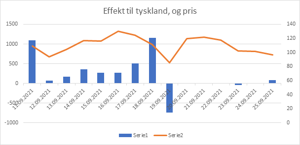 Kabelen til Tyskland ble stengt av. Hva gjorde det med kraftprisene? 11.09-25.09 viser utviklingen før og etter tysklandsforbindelsen stenges av for vedlikehold 20.09. Før denne perioden hadde prisen sitt topp-punkt på 118 €/MWh fra 30.08. I løpet av stengingen når prisene både 119 og 121 €/Mwh, som ville vært rekord i begynnelsen av september, men som likevel er litt under de høyeste prisene uka før. 16.9 og 17.09 var prisene på 130 og 124. Prisene faller derimot med stor import før nedstengingen 20.09. Og øker altså igjen like etter nedstengingen.