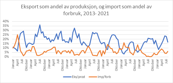 Eksport som andel av produksjon, og import som andel av forbruk: Vi har ikke tømt magasinene i større grad i år enn tidligere åre. Eksport som andel av produksjon er lavere i mai 2021 enn selv i 2018, og er på et nivå under medianen for perioden 2013-2021. Eksport som andel av produksjon var mye større fra 2013 til 2017 enn fra 2018 til i dag. Import som andel av forbruk var størst i januar 2013 og i vintrene etter tørkesomrene i 2018 og 2019.