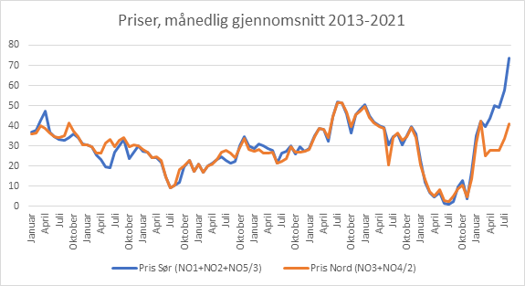 Gjennomsnittspriser: Månedlig gjennomsnittlige priser er i dag på et ekstraordinært nivå i de sørlige prisregionene (NO1, NO2 og NO5), men på et mer alminnelig nivå i midt-Norge og nord (NO3 og NO4). Prisene innenfor disse områdene samsvarer i stor grad og kan slås sammen til «sør» og «nord». Gjennomsnittene i sør og nord vokser stort sett i takt, men har et tydelig brudd i januar 2021.