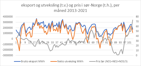 Eksport, utveksling og pris: Prisene i sør er på sine laveste nivåer når netto utveksling og brutto eksport er på sine høyeste nivåer, fra 2013 og ut 2016. Fra 2018 kryper prisen merkbart oppover, samtidig som netto utveksling blir negativ. Når eksporten øker i 2020 går også prisene ned til sine laveste nivåer for hele perioden. Her er det flom, lavere aktivitet pga corona og energipriskriger i utlandet. Prisene øker så sammenhengende fra juli 2020 (rekordlavt) og til september 2021 (rekordhøyt). Brutto eksport og netto utveksling skifter derimot ikke karakter på samme måte som prisen. Men de forholder seg høye når prisene er lave, og blir mindre når prisene vokser. Fra juni og ut august går eksporten kraftig ned, samtidig som prisene går kraftig opp.