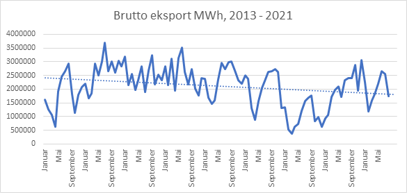Brutto eksport: Vi nådde en topp for eksport av kraft våren/sommeren 2014. Deretter har nivået sunket gradvis år for år. 2018 og 2019 var bunn-år med tørke. I 2020 tok det seg opp, da vi produserte mye vannkraft for å hindre flom. 2020 var et flom-år. Likevel var ikke eksporten større enn i 2017, og lavere enn årene tilbake til 2014.
