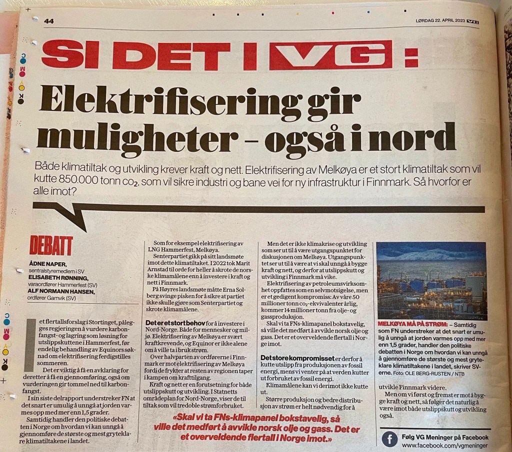 Både klimatiltak og utvikling krever kraft og nett. Elektrifisering av Melkøya er et stort klimatiltak som vil kutte 850 000 tonn co2, som vil sikre industri og bane vei for ny infrastruktur i Finnmark. Så hvorfor er alle i mot?