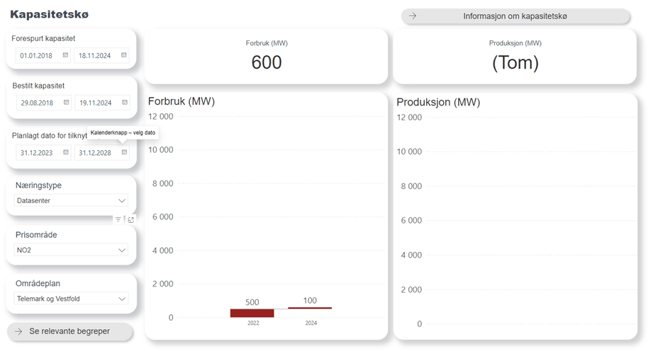 Forespurt kapasitet mellom 01.01.2018 og 18.11.2024. Bestilt kapasitet 29.08.2018-19.11.2024, med planlagt dato for tilknytning mellom 31.12.2023 og 31.12.2028.