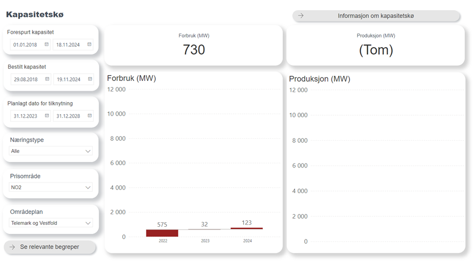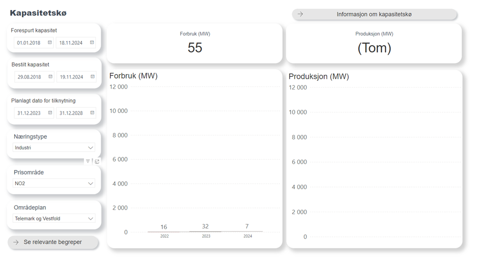 Forespurt kapasitet mellom 01.01.2018 og 18.11.2024. Bestilt kapasitet 29.08.2018-19.11.2024, med planlagt dato for tilknytning mellom 31.12.2023 og 31.12.2028.